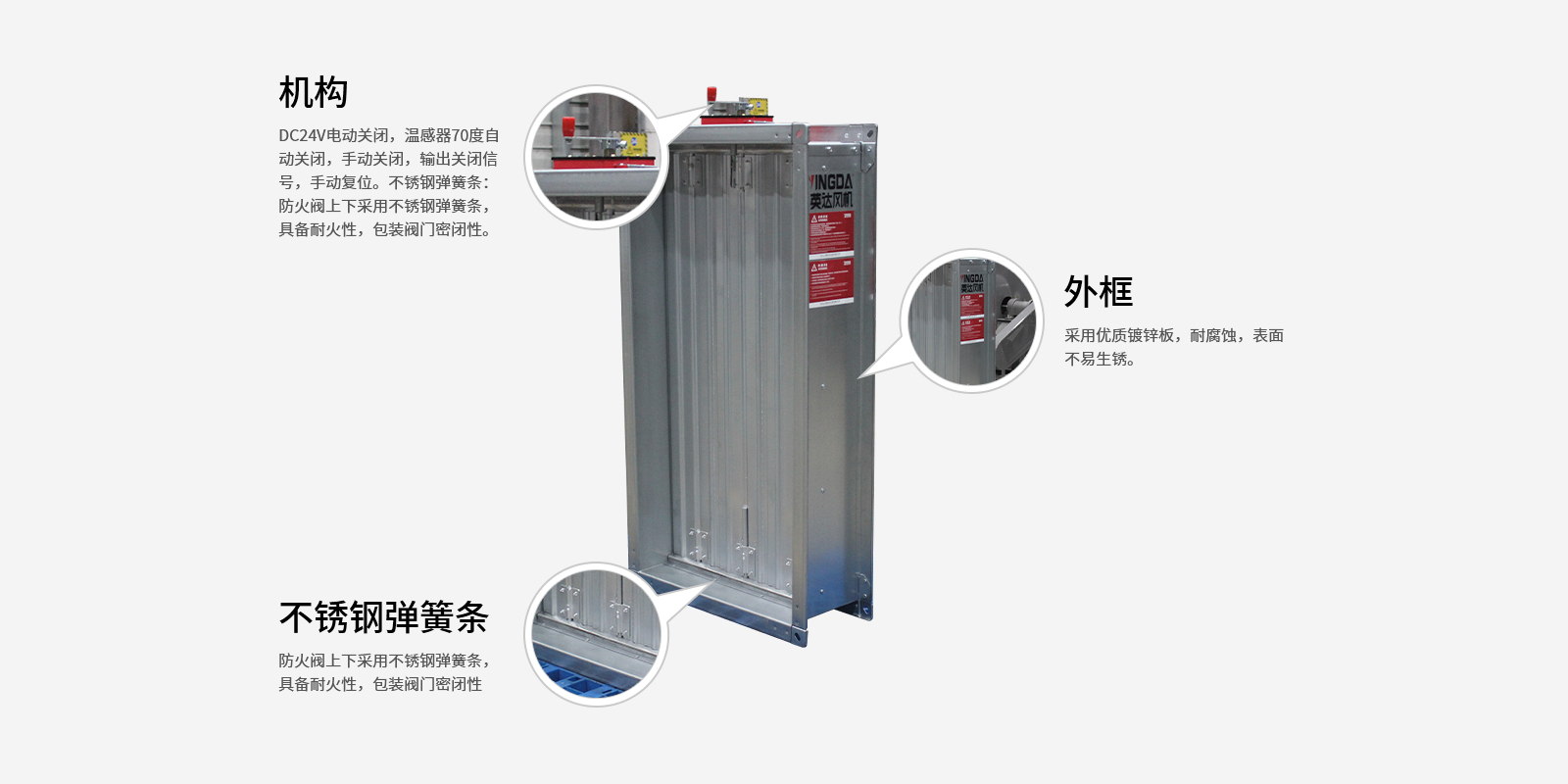 DC24V電動關閉,溫感器70度自動關閉,手動關閉,輸出關閉信號,手動復位不銹鋼彈簧條:防火閥上下采用不銹鋼彈簧條,具備耐火性,包裝閥門密閉性。