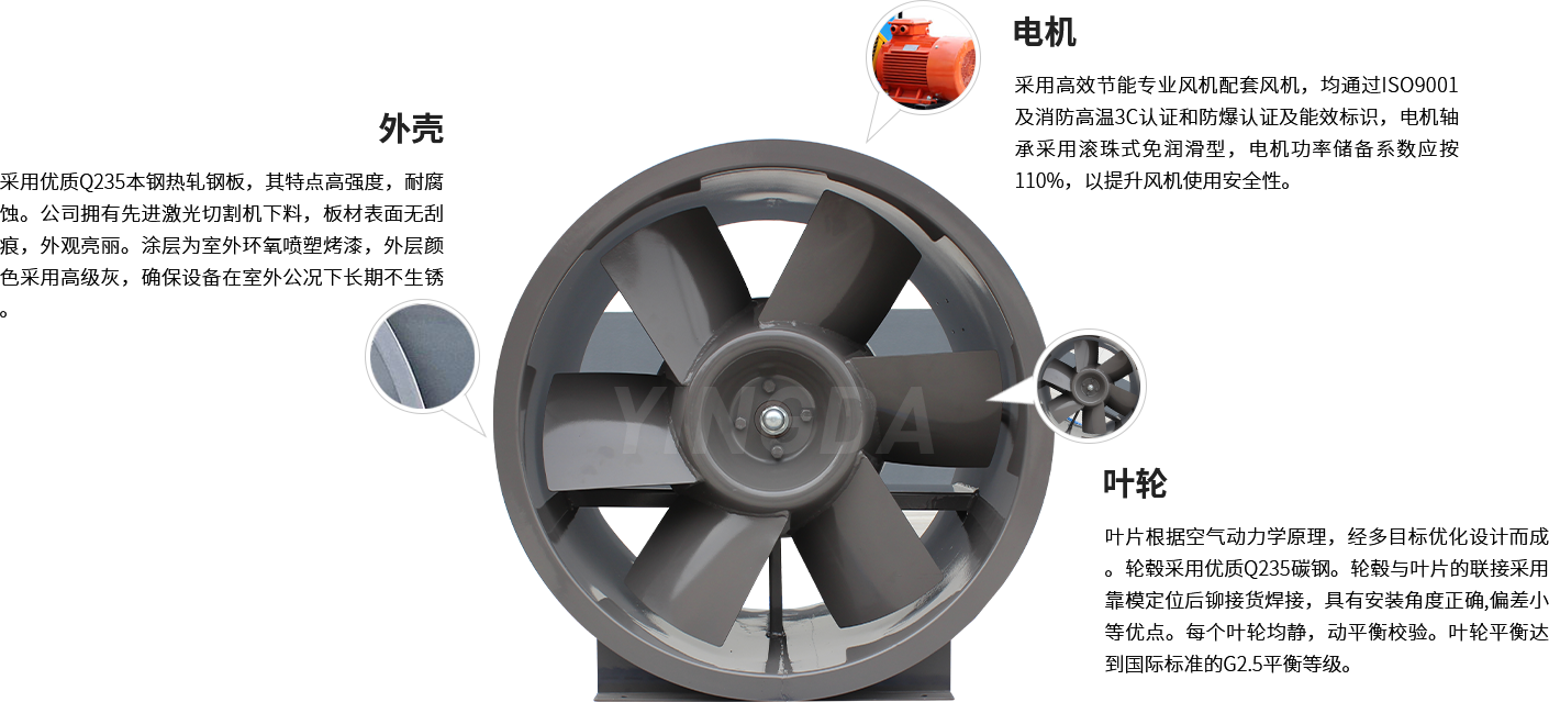 英達(dá)風(fēng)機(jī)采用生產(chǎn)電機(jī)生產(chǎn)設(shè)備和檢查手續(xù)齊全的風(fēng)機(jī)專用配套電機(jī),均通過ISO9001及消防高溫3C認(rèn)證和防爆認(rèn)證及能效標(biāo)識(shí)。電機(jī)應(yīng)與風(fēng)機(jī)負(fù)載緊密配合,采用B3安裝結(jié)構(gòu)。電機(jī)防護(hù)等級(jí)為IP54,絕緣等級(jí)F級(jí),溫升等級(jí)B級(jí)。電機(jī)軸承應(yīng)為滾珠式免潤(rùn)滑型。電機(jī)功率儲(chǔ)備系數(shù)應(yīng)按110%取,以提升風(fēng)機(jī)使用的安全性。